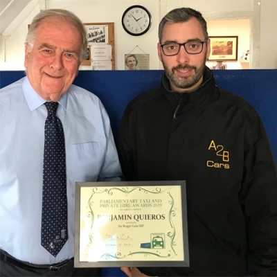 Ben Quieros, owner of A2B Cars Thanet, nominated by Sir Roger Gale for the Parliamentary Taxi & Private Hire Driver of the Year 2019. We are pleased that the outstanding customer care and service levels are appreciated by our customers.